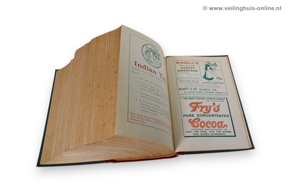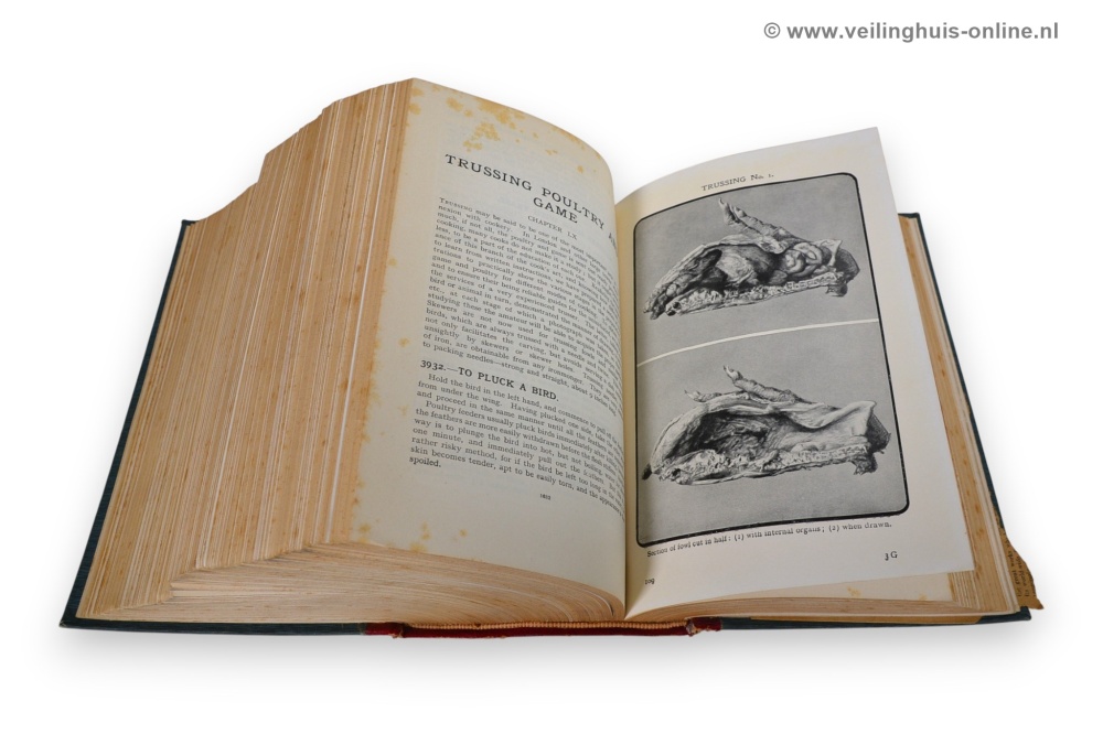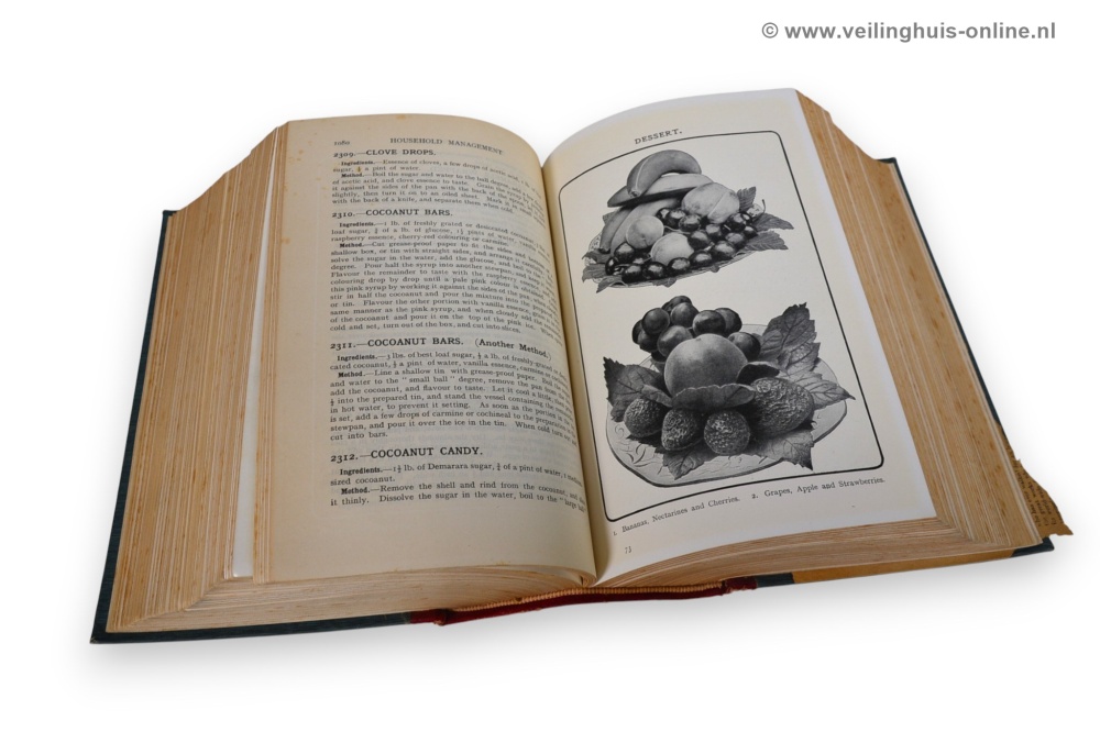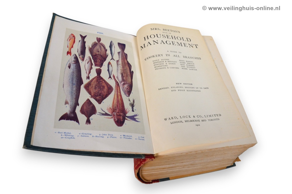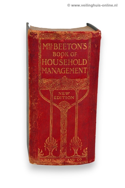 | Bijzonderheden | Boek, Mrs. Beeton's Book of Household Management. Nieuwe editie. Herzien, uitgebreid, geactualiseerd en volledig geïllustreerd. Groot boek met groene stoffen beklede platten aan de voor- en achterkant. De rug is van donkerrood leer met gouden reliëftekst en decoratief ontwerp rond de tekst. Uitgegeven door WARD, LOCK AND CO. LIMITED. Londen, Melbourne en Toronto in 1912. Mrs. Beeton's Book of Household Management, uitgegeven in 1912, is "een gids voor koken in alle takken" met diverse hoofdstukken over de internationale keuken. Het omvangrijke boek omvat dagelijkse taken, meesteres en dienstmeid, gastvrouw en gast, marketing, timmeren en snijden, menu's maken, huisarts, ziekenverpleging, de kinderkamer en de advocaat aan huis. Het boek bevat advertenties, illustraties en fotografische platen in zwart-wit, een kleurenillustratie op twee pagina's van een grote tafelsetting. Geschatte marktwaarde € 65,- Richtprijs minimaal bedrag ligt tussen € 9,- en € 19,-