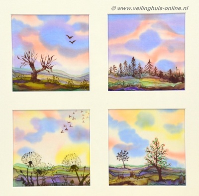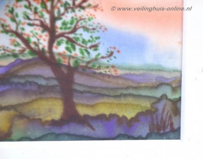 | Bijzonderheden | Zeer bijzondere techniek, in aquarel tinten op linnen |