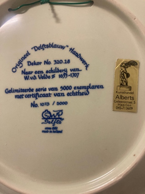 | Bijzonderheden | Delfts blauw collectors bord – Gelimiteerde oplage van 5000 stuks (1e eigenaar via kunsthandel). Verkeerd in nieuwstaat. Is origineel handbeschilderd Delfts blauw bord van “De Porceleyne Fles / Royal Delft”, Dekor nr. 320.28, naar een schilderij van Willem van de Velde II (1633–1707), en laag genummerd 1073 / 5000, dus relatief oud. Uniek collectors item! Dit Delfts blauwe bord, afkomstig uit een kunsthandel, maakt deel uit van een gelimiteerde oplage van slechts 5000 stuks. Een prachtig pronkstuk voor verzamelaars en liefhebbers van Delfts aardewerk.