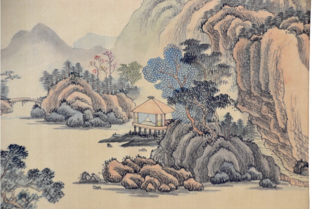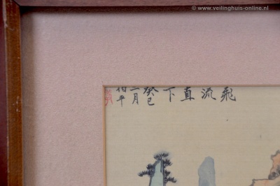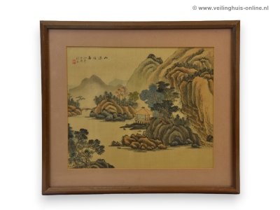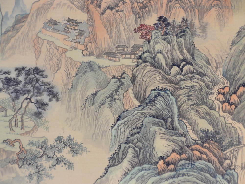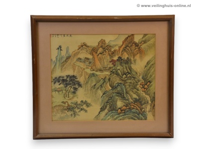 | Bijzonderheden | Landschapsschilderkunst, bekend als Shan shui (berg en water), behandelt het hoogste, meest wijdverbreide en gewaardeerde thema van traditionele Chinese kunst, om de gevoelens, ideeën en spirituele conceptie van de kunstenaar uit te drukken, in plaats van een getrouwe reproductie van de natuur. Dit soort onderzoek heeft tot doel de kijker, maar ook de kunstenaar zelf, te verwijderen uit de eentonigheid van de alledaagse werkelijkheid en gevoelens van rust en sereniteit op te wekken. In navolging van deze bedoelingen worden voornamelijk de bergen, hoge en sterke verblijfplaatsen van de goden, en de wateren, zacht en vloeiend, weergegeven. In feite, midden tussen de bergketens, ver van de beschaafde wereld, zijn schilders in staat om te communiceren met de geest en de natuur, en de verbinding tussen aarde, hemel en mensheid te realiseren. Bovendien, volgens de Taoïstische filosofie, vertegenwoordigen de hoge toppen van de bergen yang , terwijl de stromende waterstromen die ze doorkruisen, ying zijn. Juist de balans tussen deze laatste twee elementen wordt door de Chinezen beschouwd als een essentieel aspect bij het ontwerp van een landschapsschilderij. Shaded Ink Painting , in het Chinees Shui-mo , vrij ook wel als aquarel of met de hand schilderen. |