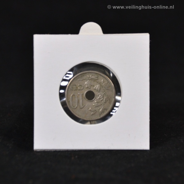 Bijzonderheden | Voorzijde: Het koninklijke monogram van koning Leopold II is omringd met een legende in het Frans. Datum onder. Keerzijde: Het middelste gat wordt geflankeerd door een olijftakje en een waarde. Ontwerper onder. |