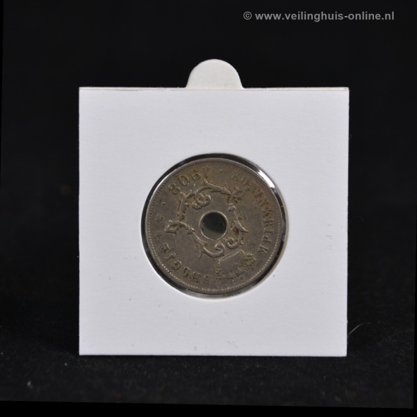 | Bijzonderheden | Voorzijde: Het koninklijke monogram van Koning Leopold II is omringd met Nederlandse letters. Datum onder. Keerzijde: Het middelste gat wordt geflankeerd door een olijftakje en een waarde. Ontwerper onder. |
