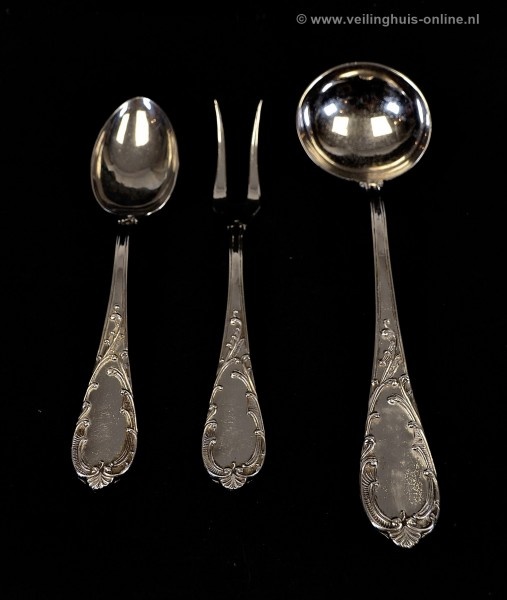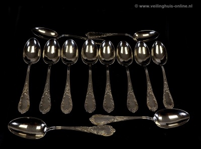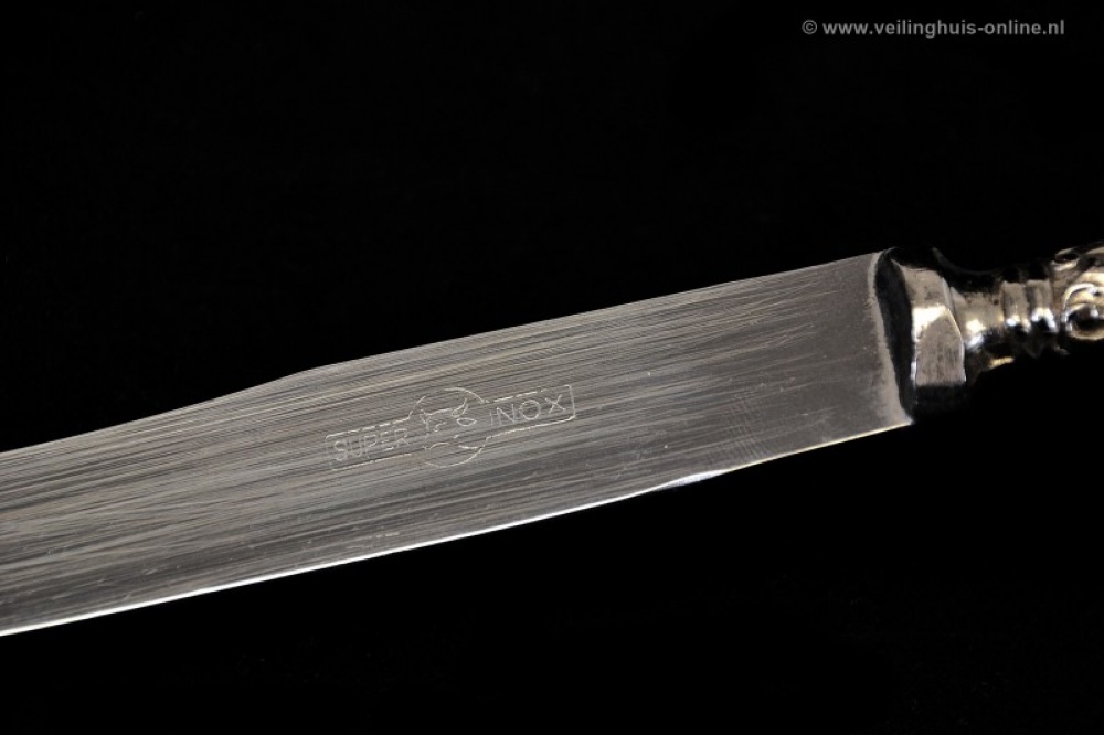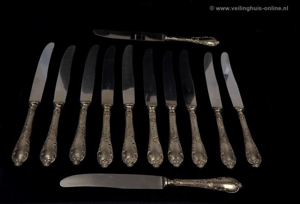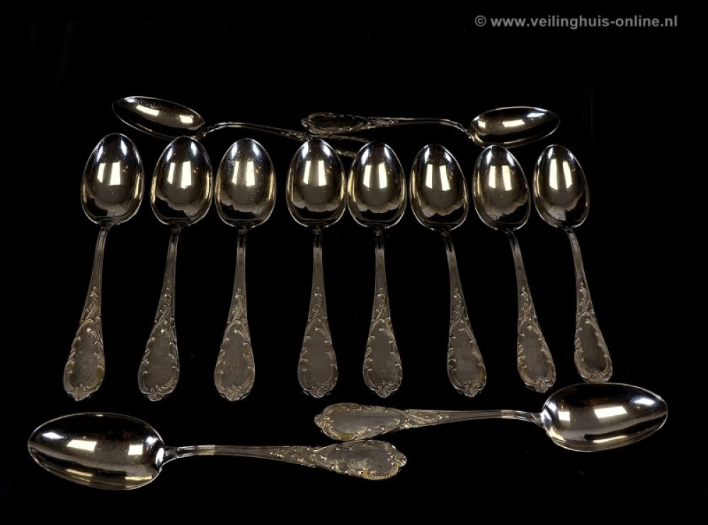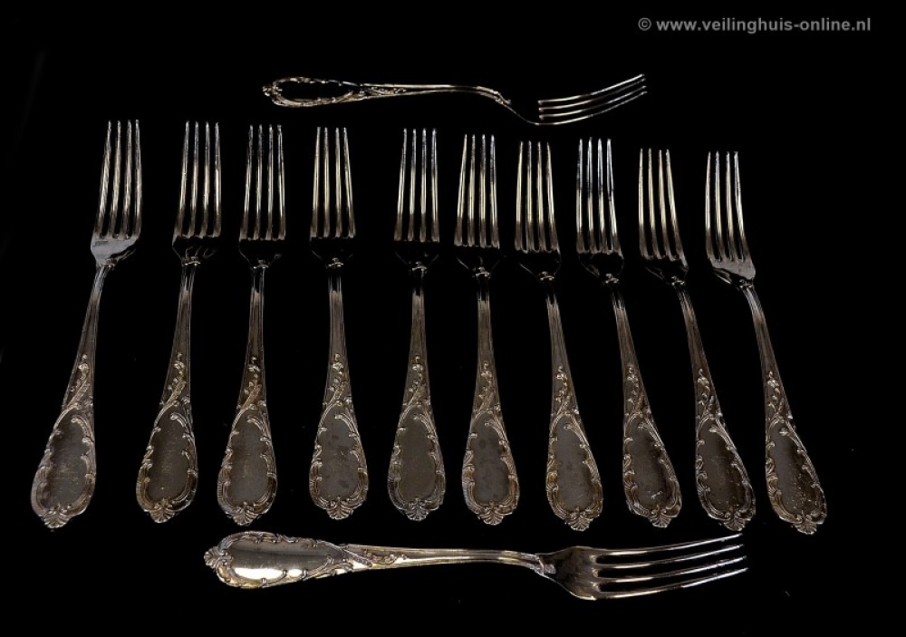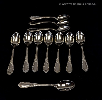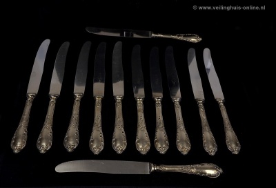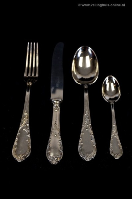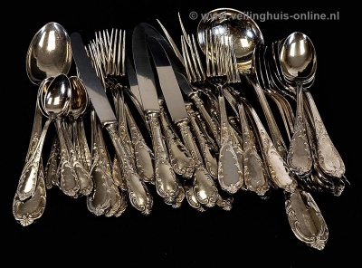 | Bijzonderheden | Bestek is massief verzilverd en gemarkeerd ARG 800, bestaande uit: Soeplepel Opscheplepel Vleesvork 11 Dessertlepels 12 Eetlepels 12 Dinervorken 12 Dinermessen Foto's maken deel uit van de omschrijving |