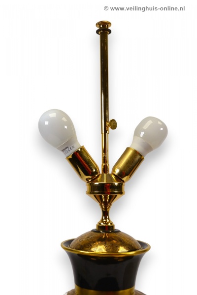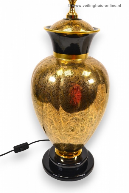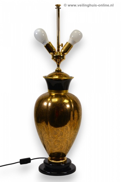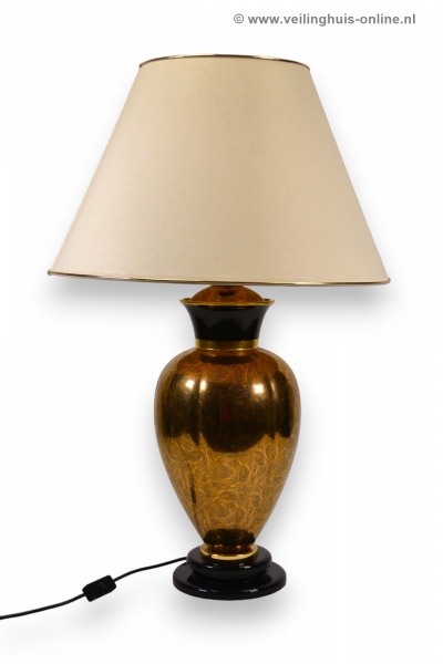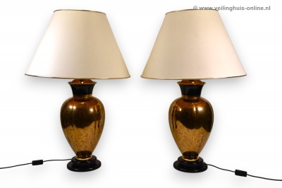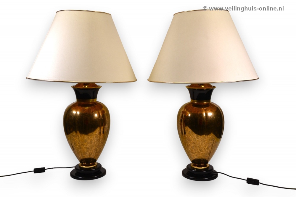 | Bijzonderheden | 2 Zeer bijzondere tafellampen van het exclusieve merk Manifattura Artistica Le Porcellane - Florance Italy Handgeschilderd met 24 karaats goud. De lampen hebben een motief van zwarte sierlijke draaiingen op een gouden achtergrond, zwarte voet en middenstuk. De lampen zijn in hoogte te verstellen Ieder lamp heeft 2x E27 fitting en een knipschakelaar op de draad De gemiddelde marktwaarde van de lamp per stuk is € 600 Foto's maken deel uit van de omschrijving Richtprijs minimaal bedrag ligt tussen € 381,- en € 421,- |