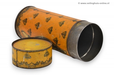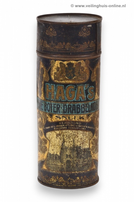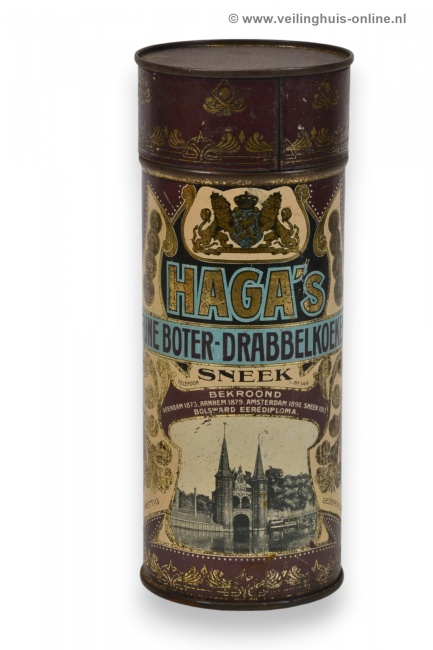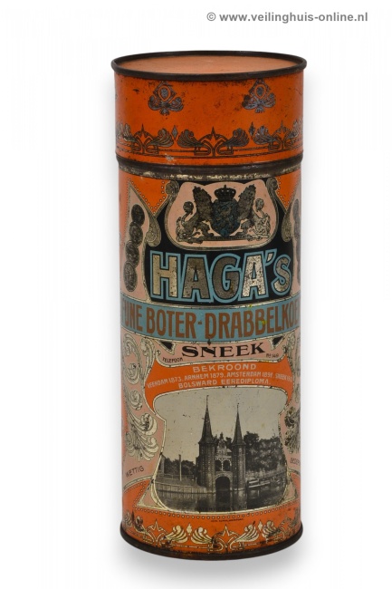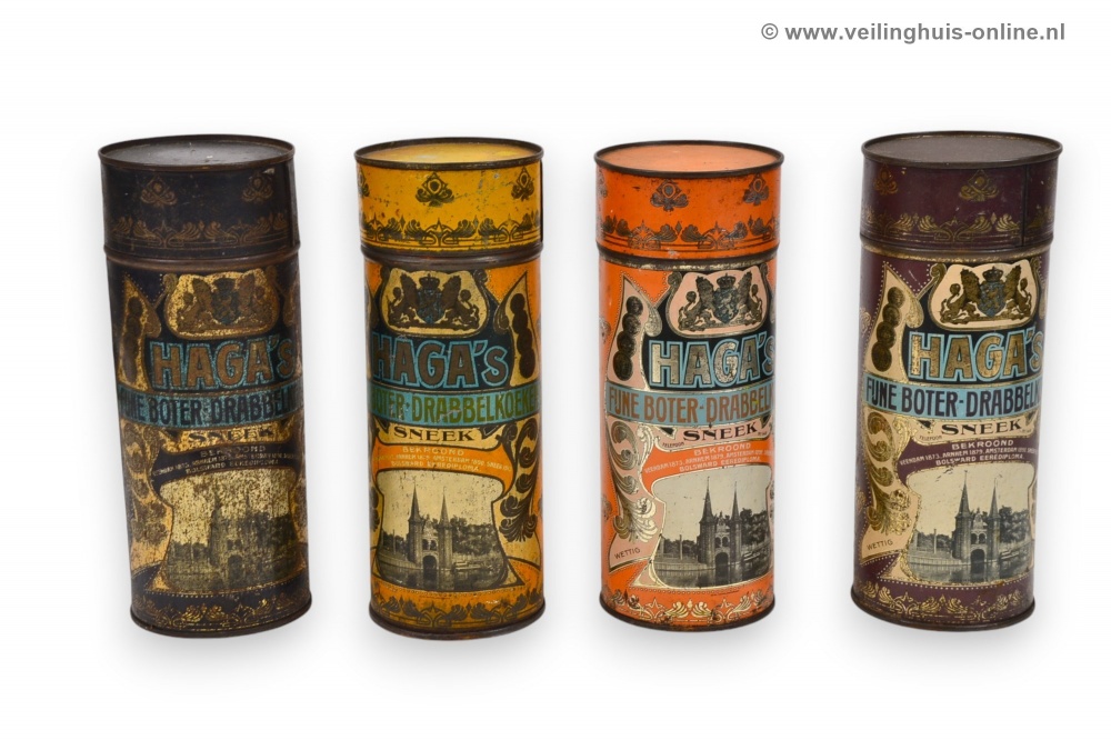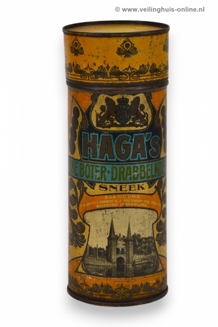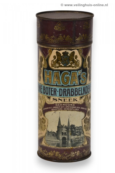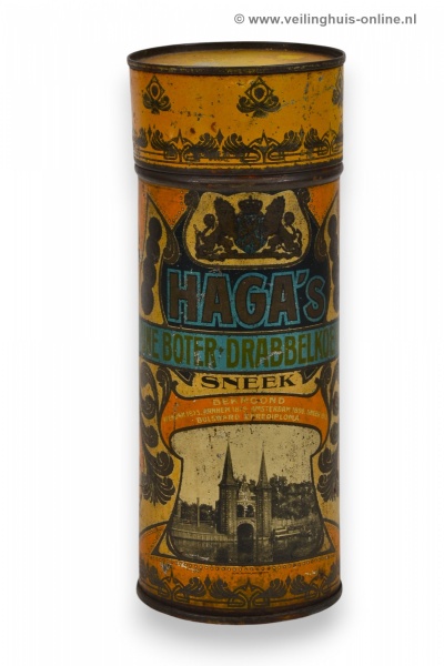| Bijzonderheden | Blikken bussen voor het verpakken van drabbelkoeken van Haga. De blikken zijn bedrukt en zijn versierd met jugendstil ornamenten en een voorstelling van de Waterpoort te Sneek, het wapen van Nederland en prijsmedailles. Tekst: 'Haga's / fijne boter-drabbelkoeken / Sneek / Bekroond / Veendam 1873 / Arnhem 1879 / Amsterdam 1890 / Sneek 1913 Bolsward / Eere Diploma'. |