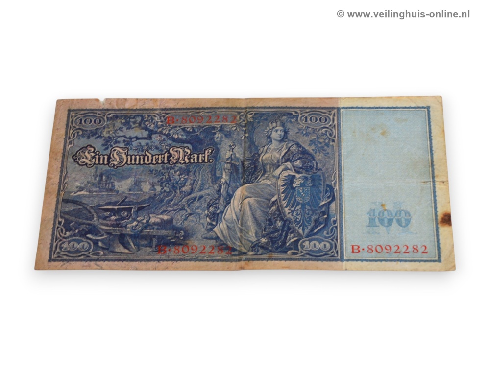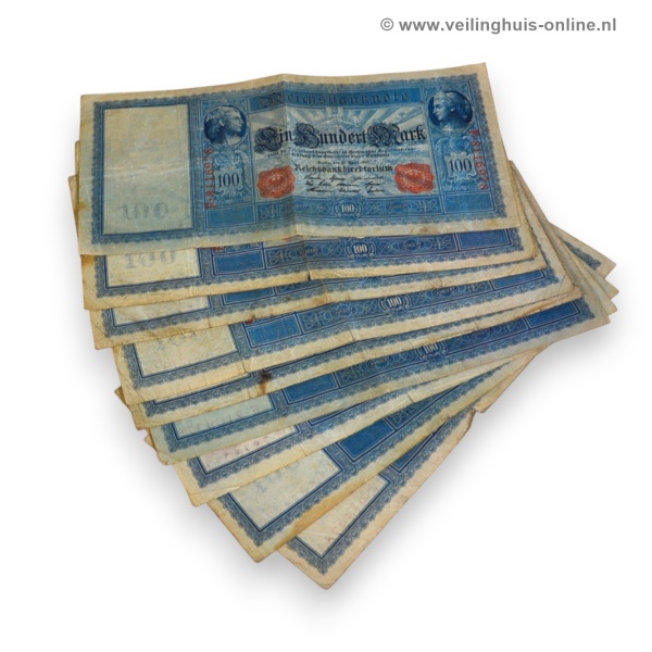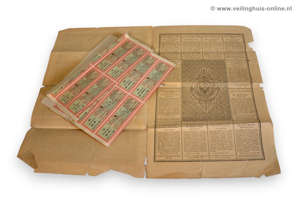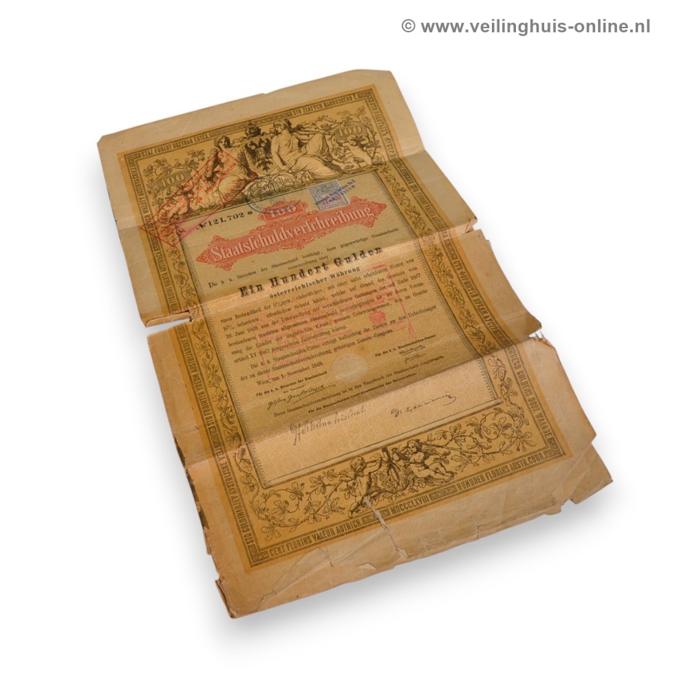 | Bijzonderheden | 9 x Bankbiljet - Ein Hunderd Mark Duitsland - 207 × 102 mm Voorzijde: Mercurius en Ceres hoofd, twee rode zegels Keerzijde: Germania zittend onder een eik, op de achtergrond de keizerlijke vloot 1 Oostenrijkse staatsobligatie uitgegeven in 1868 in Wenen Het document is een "staatsfchuldverfchreibung"( Staatsschuldbewijs) met een waarde van Ein Hunderd Gulden in Oostenrijkse valuta |