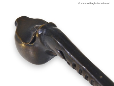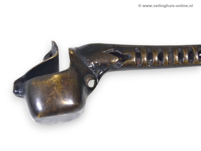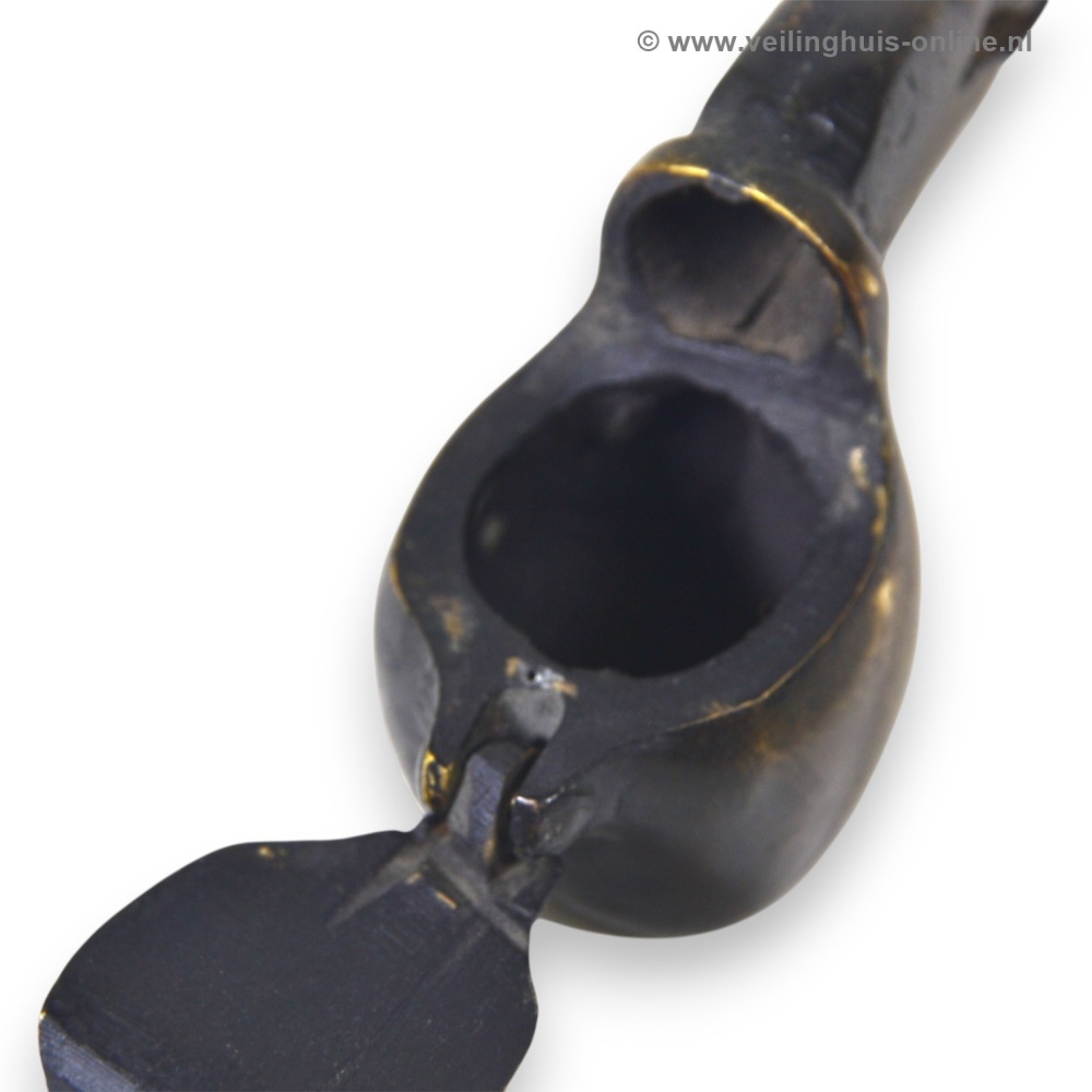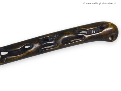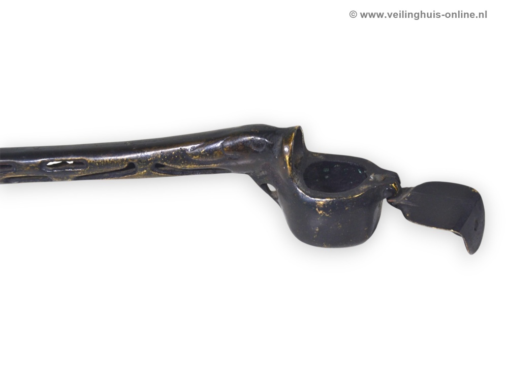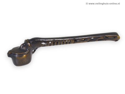 | Bijzonderheden | Yatate: Kleine, persoonlijke schrijfsets in de vorm van een rookpijp uit het middeleeuwse Japan. Het bevat een doosje voor de inktkatoen en een schacht voor een penseel. Tijdens de Kamakura-periode (1185-1333) werd het idee van met inkt verzadigd katoen ontwikkeld. Door een kalligrafiepenseel tegen het katoen aan te houden, kon men de borstelharen inkten met een verminderd risico op druppelen of morsen. Door het katoen in een doosje ( sumi tsubo ) te doen, werd een schrijfset handig en draagbaar. De eerste Yatate waren lange dozen, met het inktreservoir in de as van de pen . De "rookpijp"-vorm was bedoeld om de hoeveelheid beschikbare inkt te vergroten. Geschatte marktwaarde € 110,- Richtprijs minimaal bedrag ligt tussen € 14,- en € 24,- |