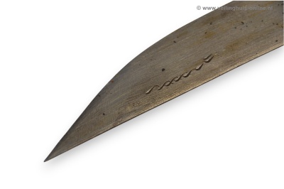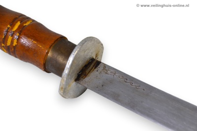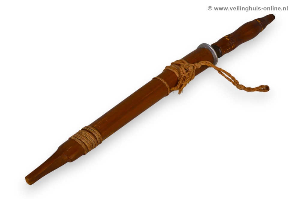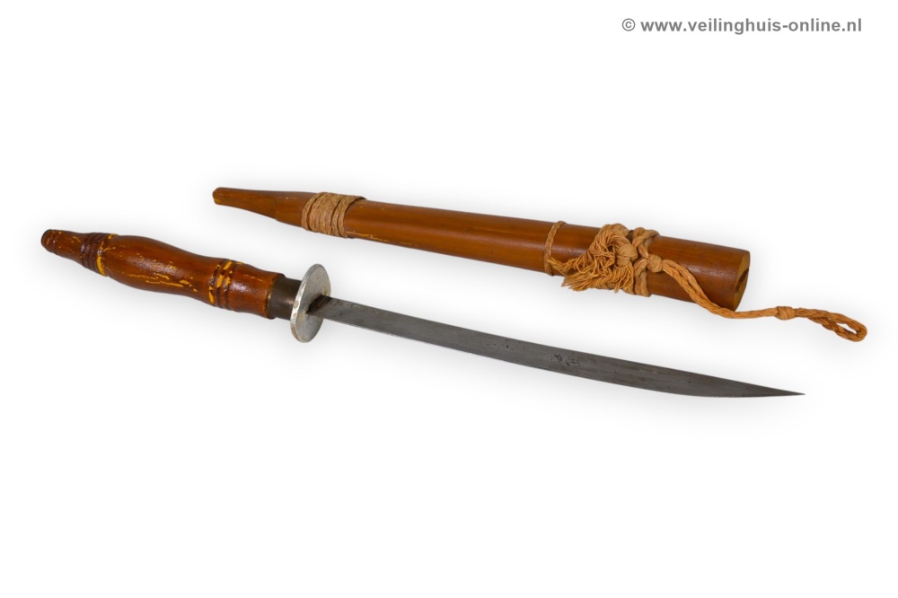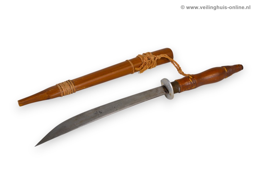| Bijzonderheden | Dit traditionele antieke Thaise zwaard stamt uit de late 20e eeuw en staat bekend als een daab of dha. Ze zijn te vinden in Birma, Laos, Thailand en Cambodja en zouden al in de 16e eeuw dateren. Deze zwaarden werden thuis bewaard voor persoonlijke bescherming. Wettelijke aspecten in Nederland