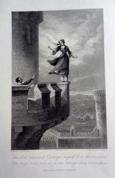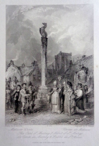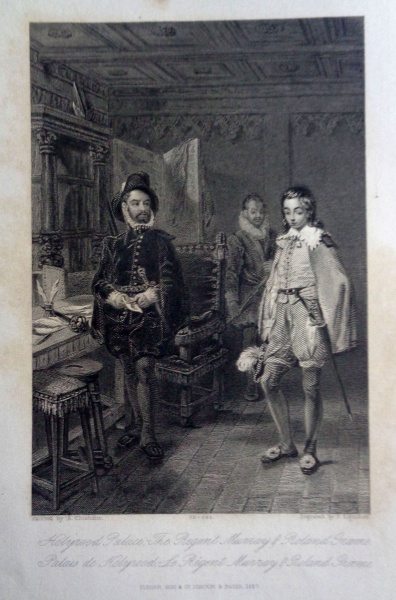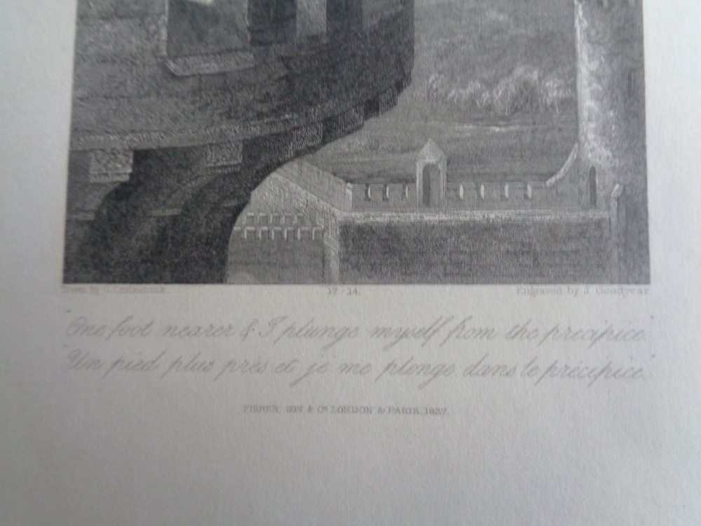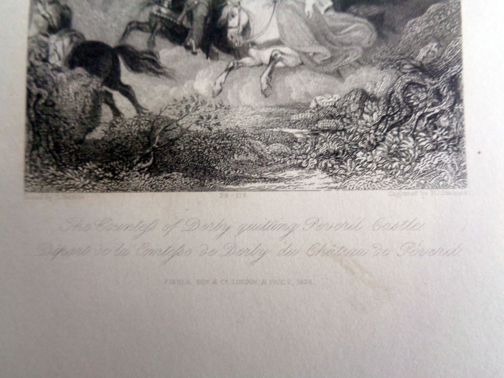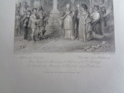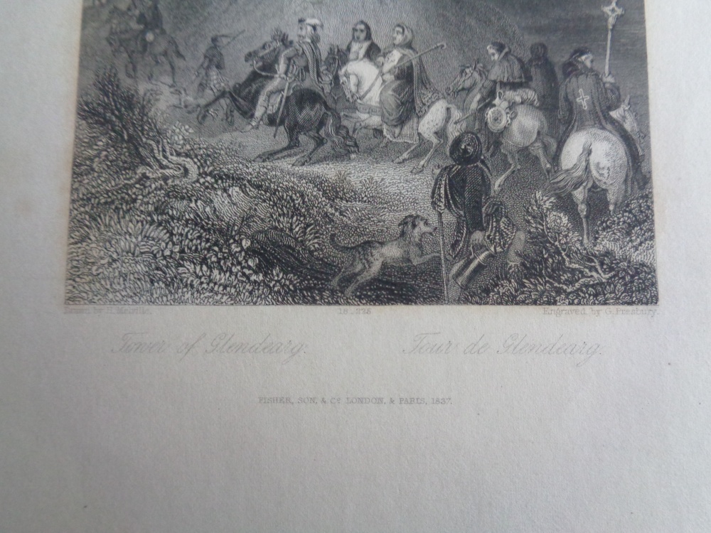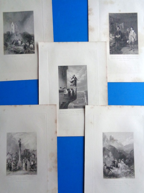 1/ Melrose Cross. The Earl of Murray & Abbot of St Marys Drawn by H. Melville - Engraved by R. Staines 2/ The Countess of Derby quitting Peverit Castle Drawn by H. Melville - Engraved by R. Staines 3/ One foot nearer & I plump myself from de precipice Drawn by G. Cruiksband - Engraved by J. Goodyear 4/ Tower of Glendearg Drawn by H. Melville - Engraved by G. Presbury 5/ Hobyrood palace.The Regent Murray & Roland Grame Drawn by A. Chisholm - Engraved by P. Lightfoot