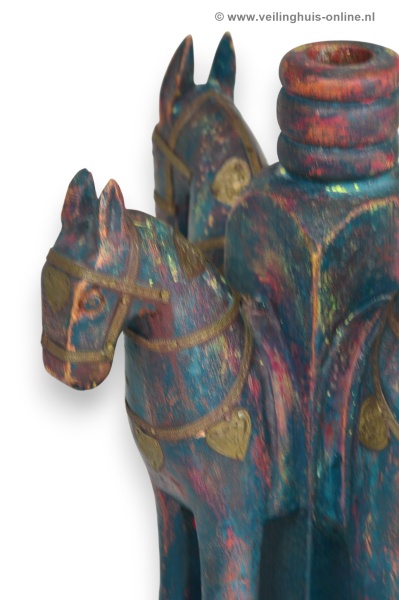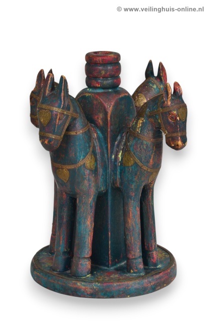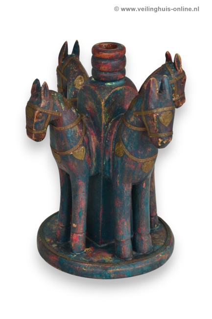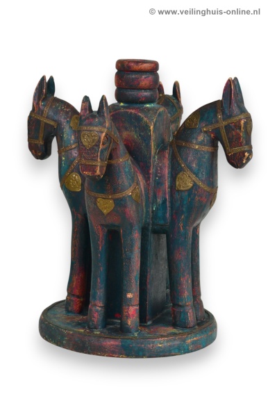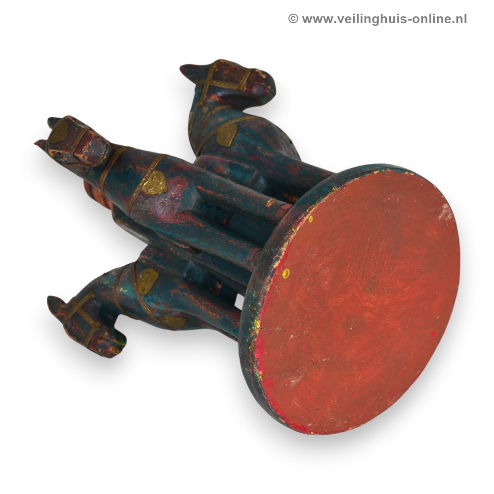 | Bijzonderheden | Gemaakt van hout met een verweerde veelkleurige afwerking in blauw/rood en groen tinten, versierd met gestempelde koperen of messing details op de paarden. Paarden staan in een beschermende cirkel, kijkend naar buiten |