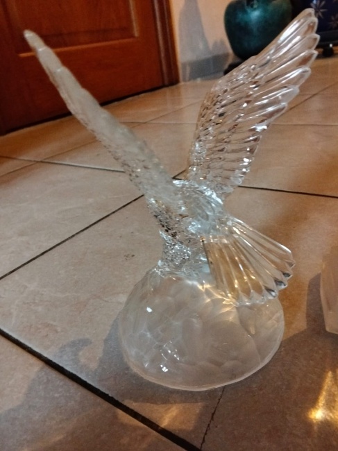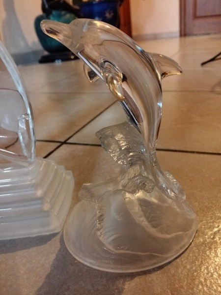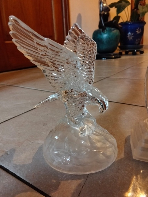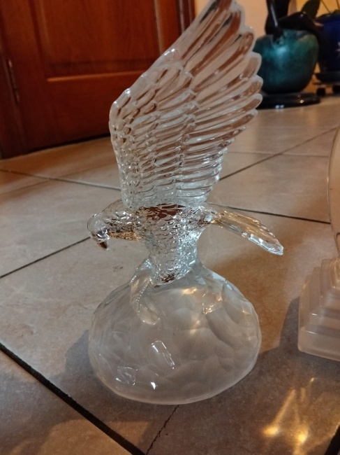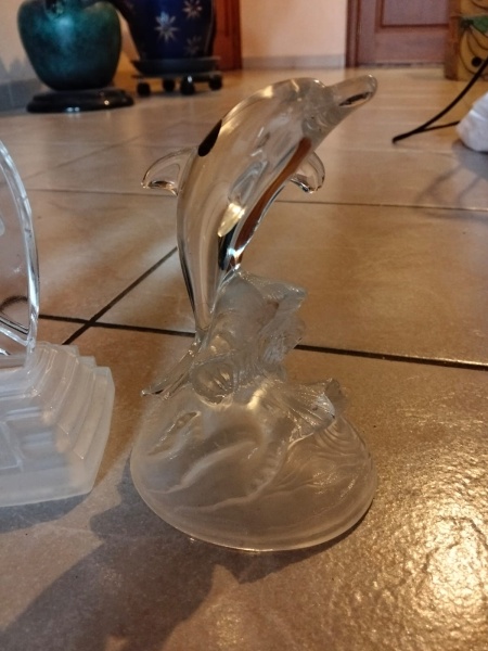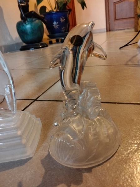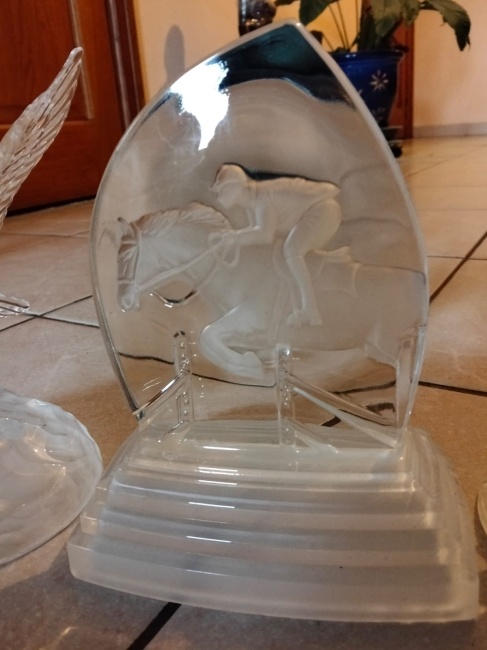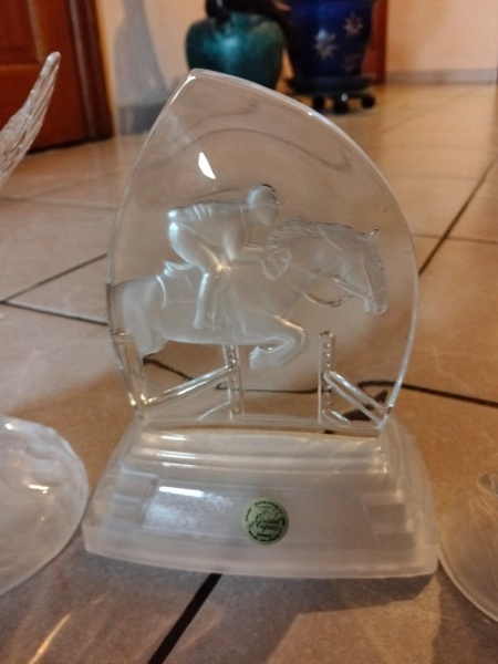 | Bijzonderheden | Drie kristallen beeldjes van Cristal d'Arques, een adelaar van 22cm hoogte, afbeelding springruiter van 19cm hoogte en een dolfijn van 16cm hoogte.