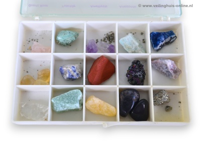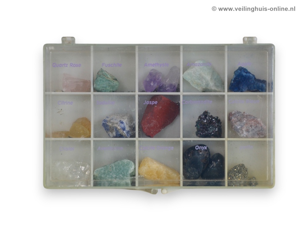 | Bijzonderheden | 15 verschillende ruwe edelstenen Quartz Rose, Fuschite, Amethyste, Amazonite, Agate, Citrine, Sodalite, Jasper, Carborandite, Calcite Bleue, Cristal, Aventurine, Calcite Orange, Onyx, Pyrite |