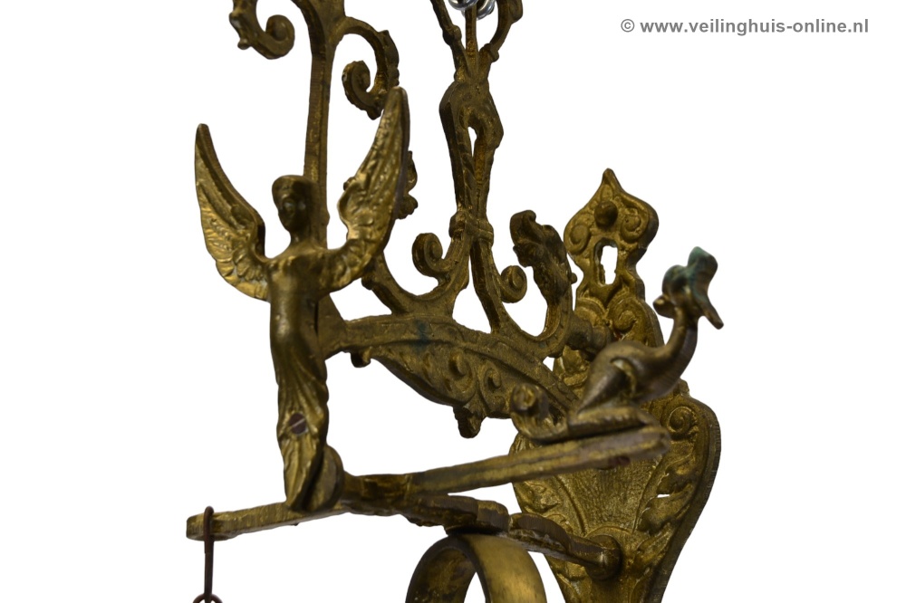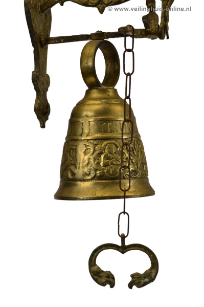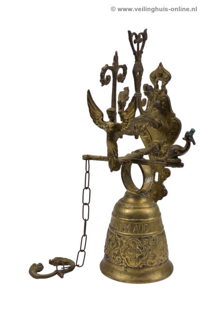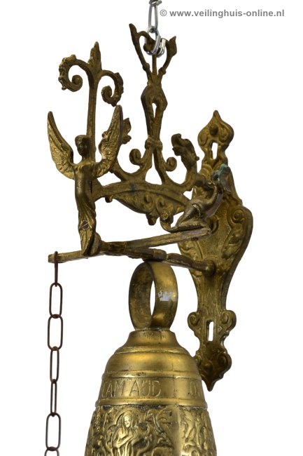 | Bijzonderheden | Koperen deurbel met achterplaat voor bevestiging aan de wand. Het geheel is gedecoreerd met diverse dieren en bovenop staat een engel met gespreide vleugels. Voorzien van een handgreep aan ketting om de bel te luiden.