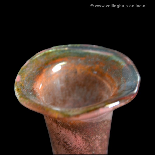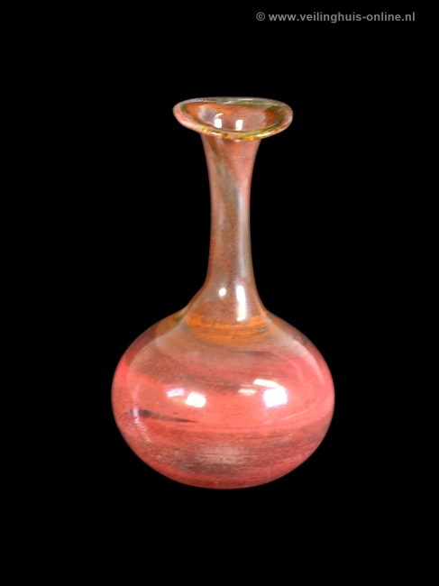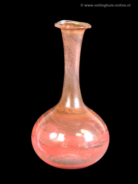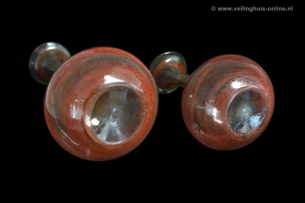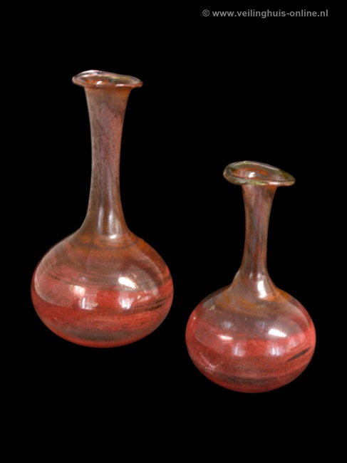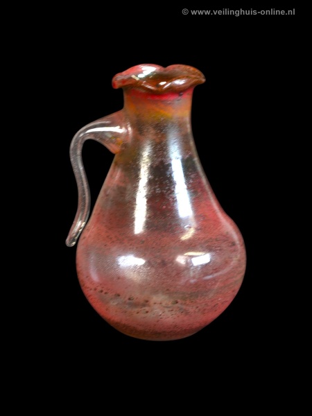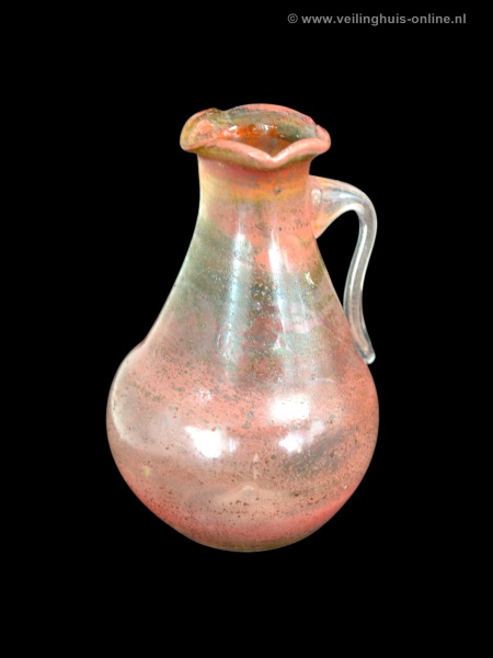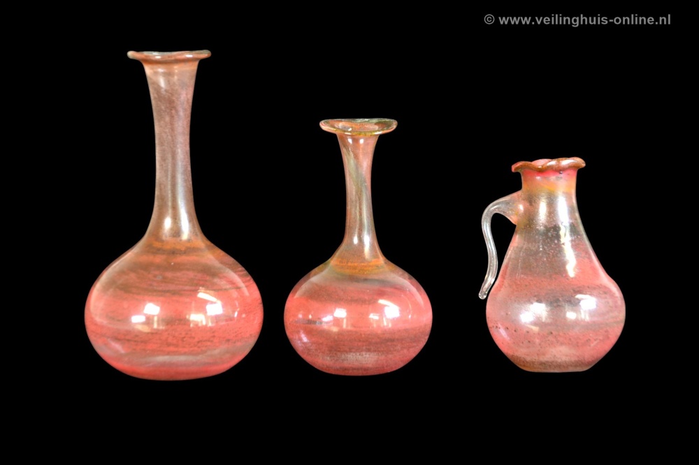 | Bijzonderheden | 3 Antieke vaasjes in de vorm van een schenkkannetje, 2 keer een gedraaide slanke hals en een bolle basis. De vaasjes hebben een roze/paarse kleur met bruine wervelende patronen. Zeer fragile Geen merktekens of graveringen gevonden Geschatte marktwaarde € 195,- Richtprijs minimaal bedrag ligt tussen € 31,- en € 58,-