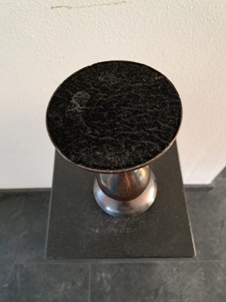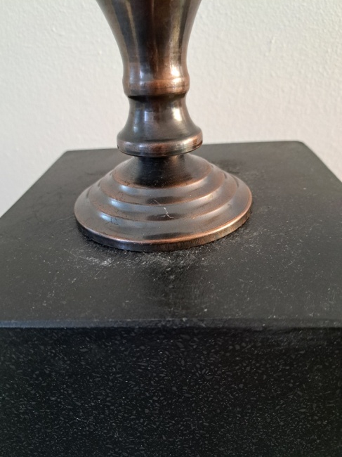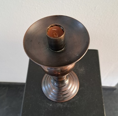 | Bijzonderheden | Messing Gepatineerde Kaarsen Standaard De bodem is bekleed met fluweel De herkomst is Italië Rond 1960 Hoogte : 20 cm Bovenkant diameter : 9 cm Voet diameter : 10 cm |