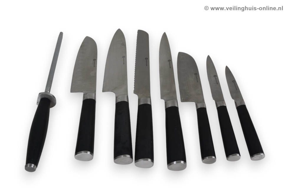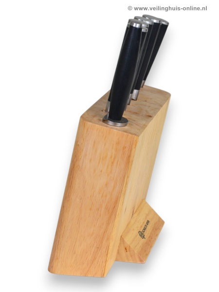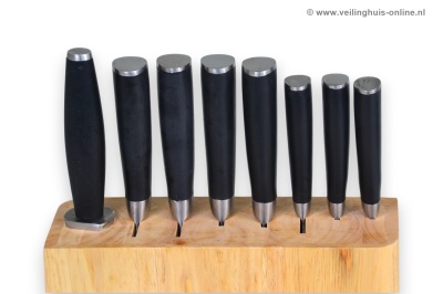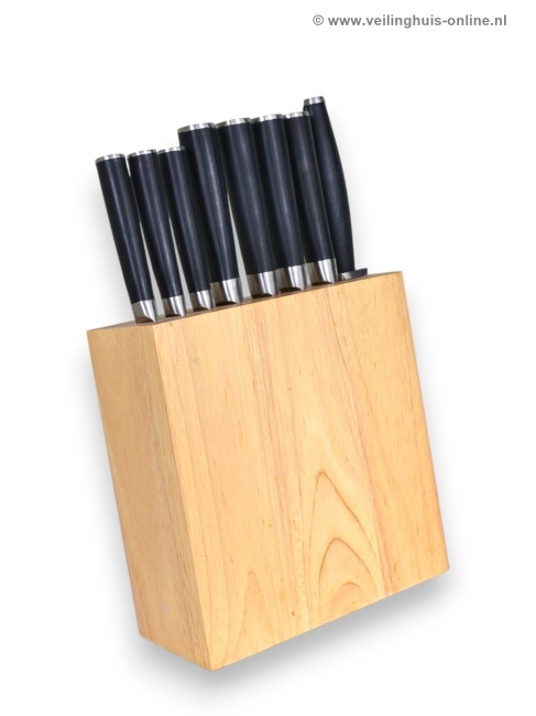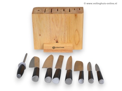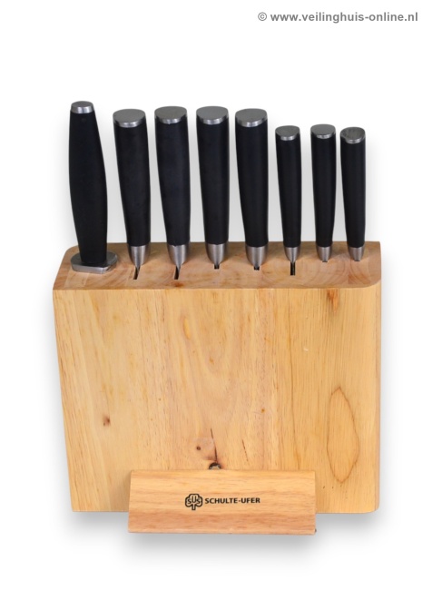 | Bijzonderheden | Compleet messenblok van het merk Schulte Ufer 9 Delig: 7 verschillende soorten messen 1 Aanzetstaal 1 Zwaar beukenhouten messenblok Geschatte marktwaarde € 70,- Richtprijs minimaal bedrag ligt tussen € 9,- en € 19,- |