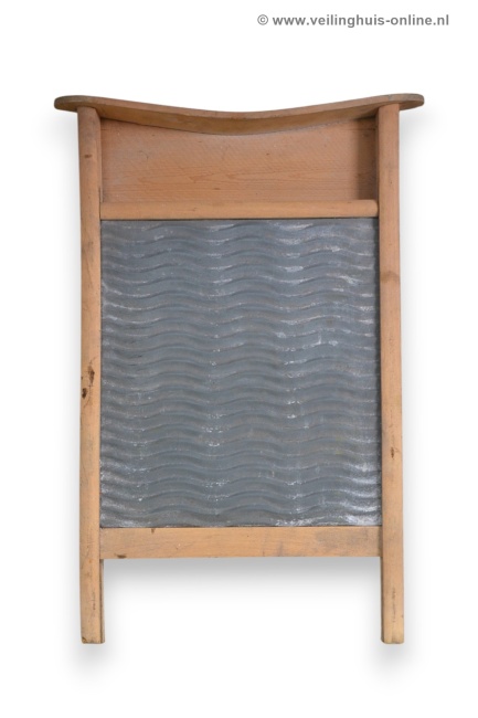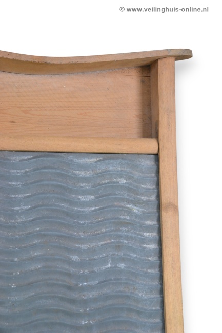 | Bijzonderheden | Antiek wasbord Vroeger waste men alleen op de hand. Het zinken gedeelte van het wasbord is geribbeld. Door met het wasgoed over de ribbels te bewegen/schrobben gingen de vlekken eruit. Ook gebruikt als muziekinstrument, met een vingerhoed op elke vinger kun je een ritmisch raspend geluid voortbrengen. |