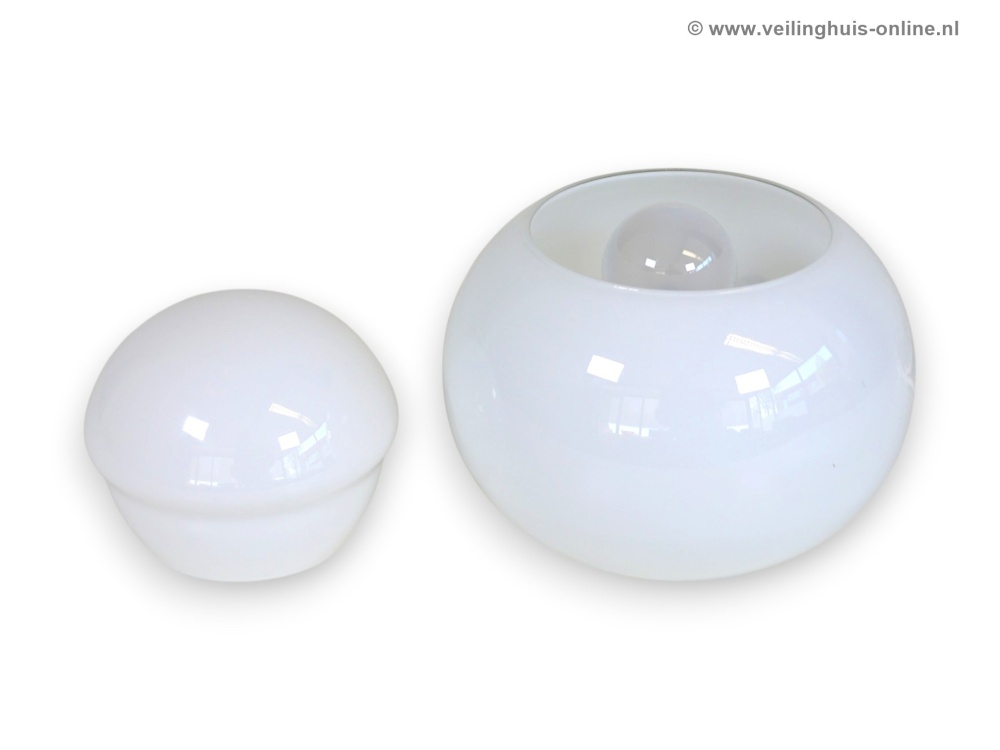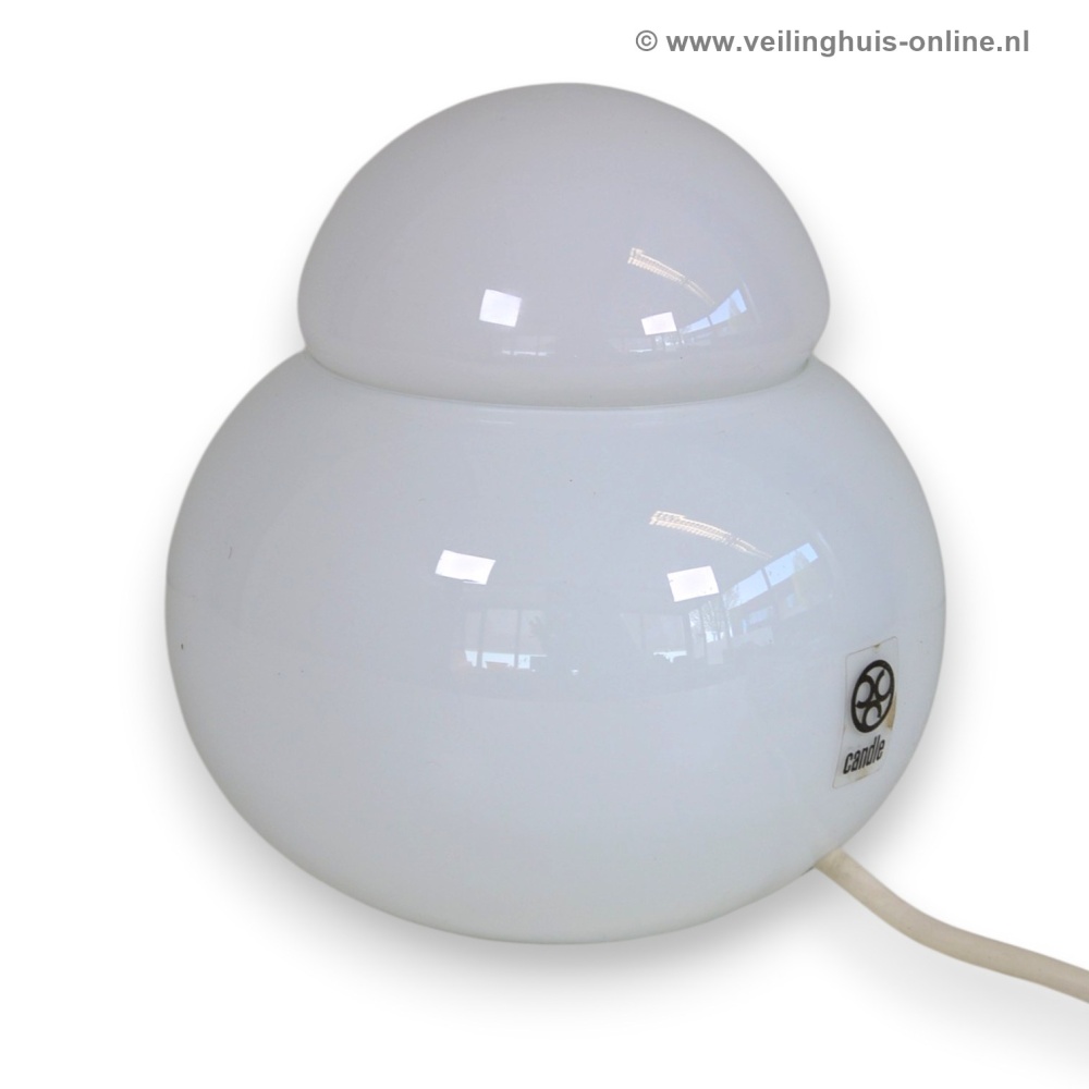 | Bijzonderheden | In 1968 ontwierp de gerenommeerde architect en ontwerper Sergio Asti de Daruma tafellamp voor het Italiaanse bedrijf Candle. Latere versies zijn gemaakt door Fontana Arte. De lamp is gemaakt van twee samengevoegde koepels in mondgeblazen glas waardoor de fitting binnenin gemakkelijk bereikbaar is. Het witte glas verlicht de hele lamp en geeft een warme, aangename gloed af, waardoor het ideaal is voor accentverlichting. Knipschakelaar op de draad E 27 fitting Geschatte marktwaarde € 345,- Richtprijs minimaal bedrag ligt tussen € 59,- en € 79,- |